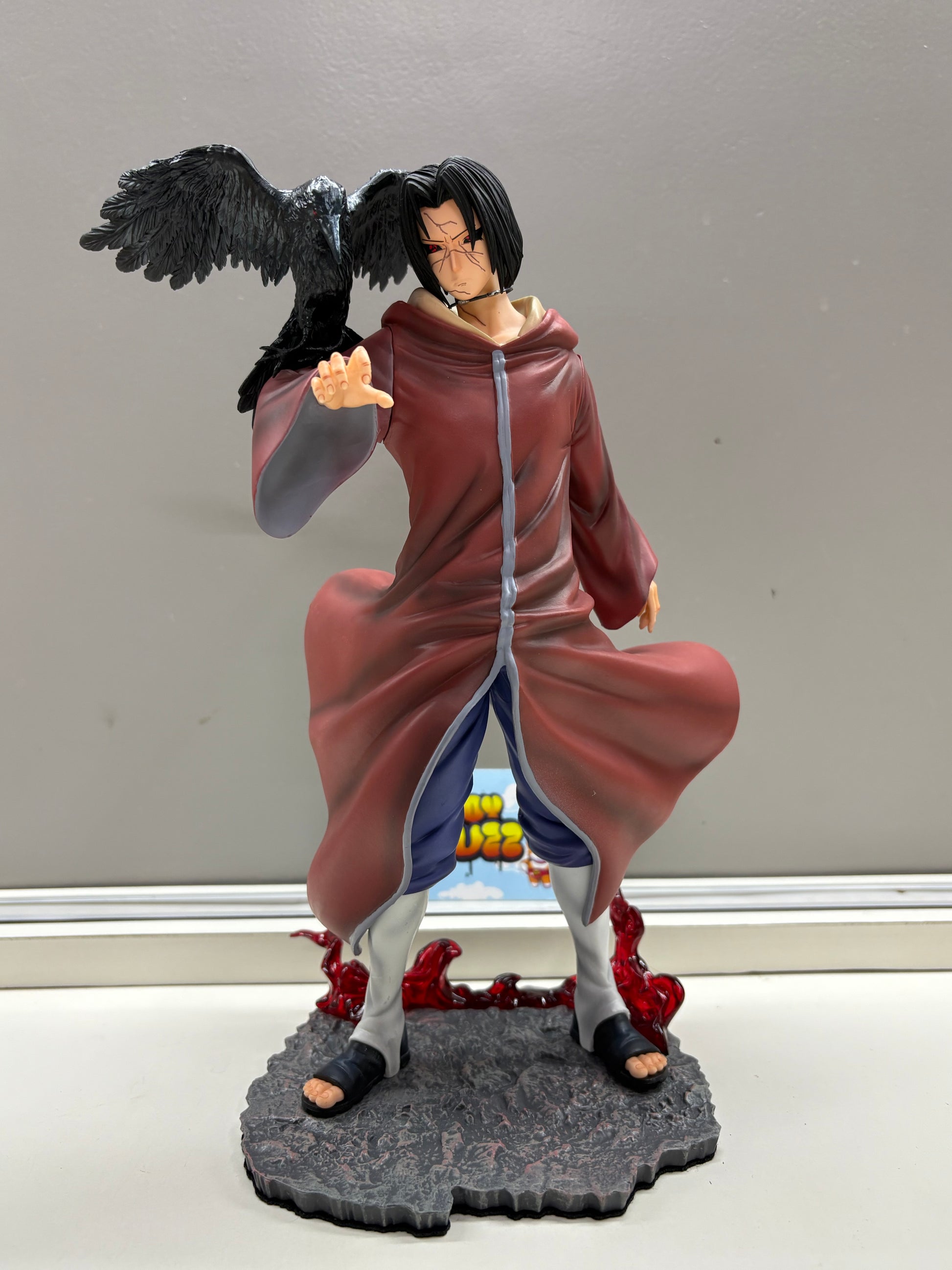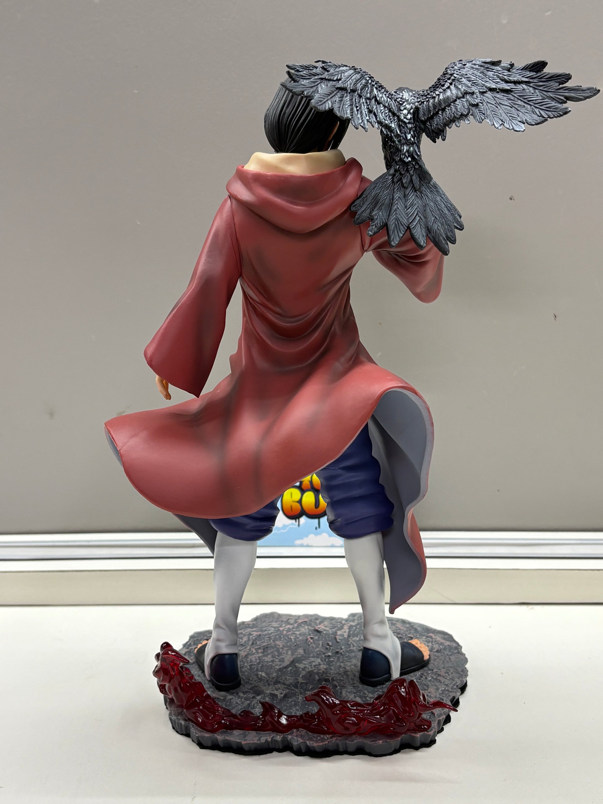 - The figure depicts the character Itachi Uchiha alongside a crow, which symbolizes his mastery of genjutsu.